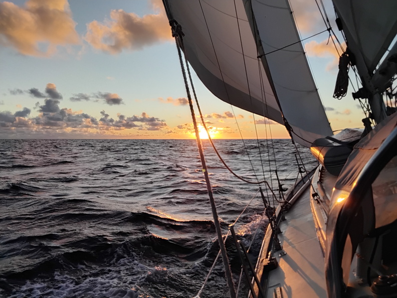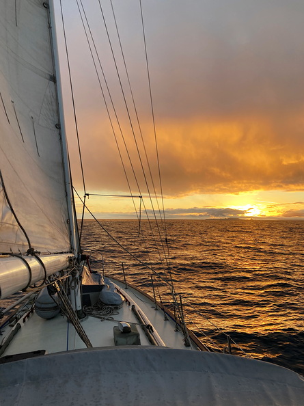 The night was pretty long but eventually I was nearly abeam Ensenada and turned in toward land. The sun was just starting to show itself and with the change in heading, we got a more favorable breeze so I raised sail. The stability from having sails up really helped the motion of the boat. Kelli got up not long after and we greeted the sunrise heading east.