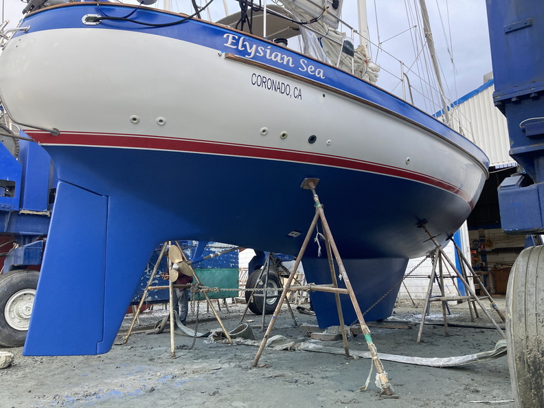 After that long first overnight trip we motored into Ensenada while texting the boatyard to figure out where they wanted us. The timing was perfect. They had just finished launching a sailboat and we saw them motor out as we motored in to the boatyard. With some hand gestures and yelling across the water I was told to back to boat into the travelift. I whipped it around, backed it into the narrow waterway like a teenager learning how to parallel park, and we were secured to land again. It took about an hour to get things positioned, remove the backstay since it was running into the travelift's supports, and pull us out of the water. This was our first time seeing Elysian Sea out of the water.